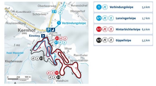 Die Kernhofer Loipen sind direkt mit der Verbindungsloipe St. Aegyd - Kernhof und damit auch mit den Panormaloipen verbunden. Sie befinden sich direkt unter dem Gippel und haben daher eine traumhafte Aussicht auf den Gippel.